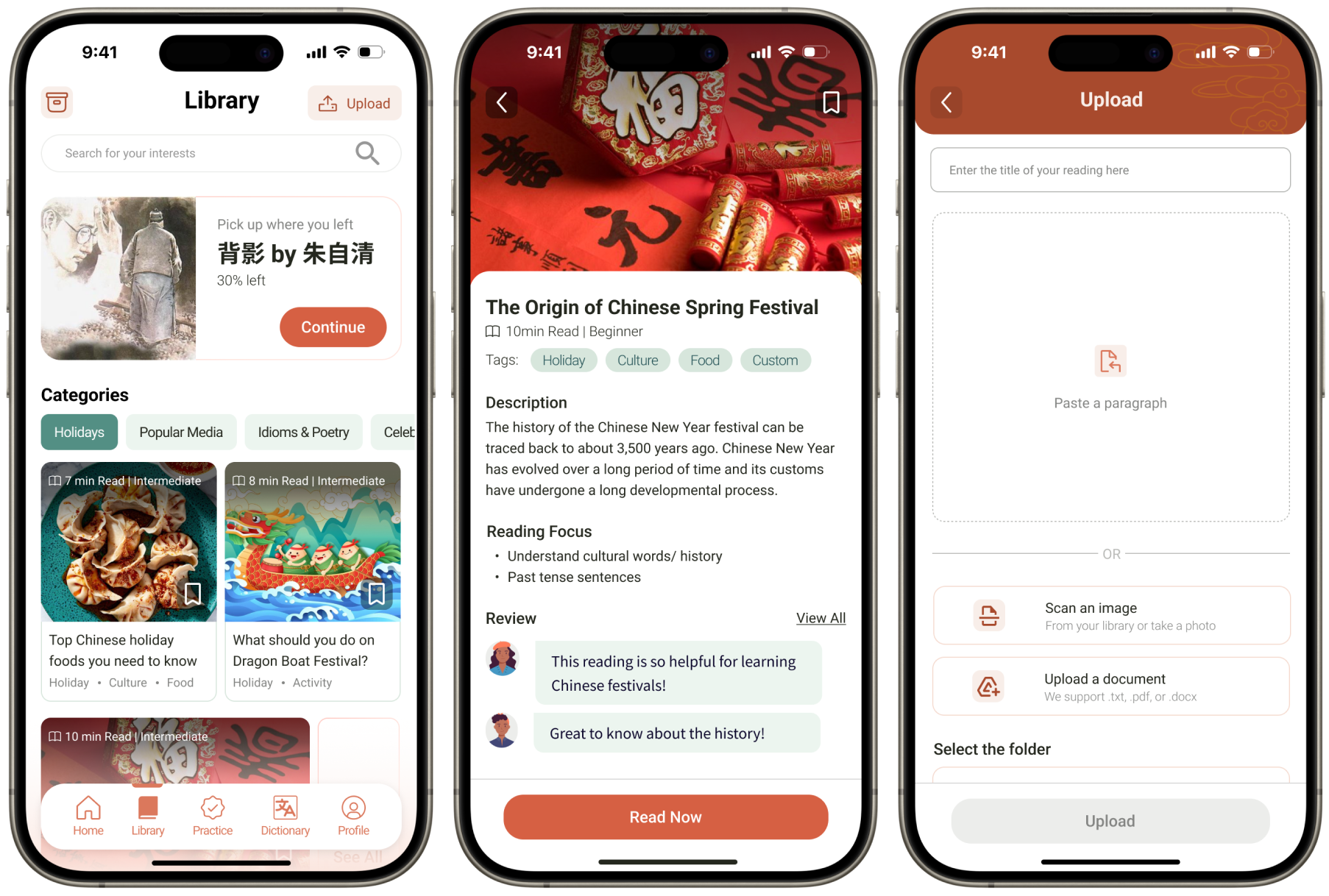 Categorized reading materials along with two core features: “Upload” and “Archive”, complemented by “Pickup where you left off”